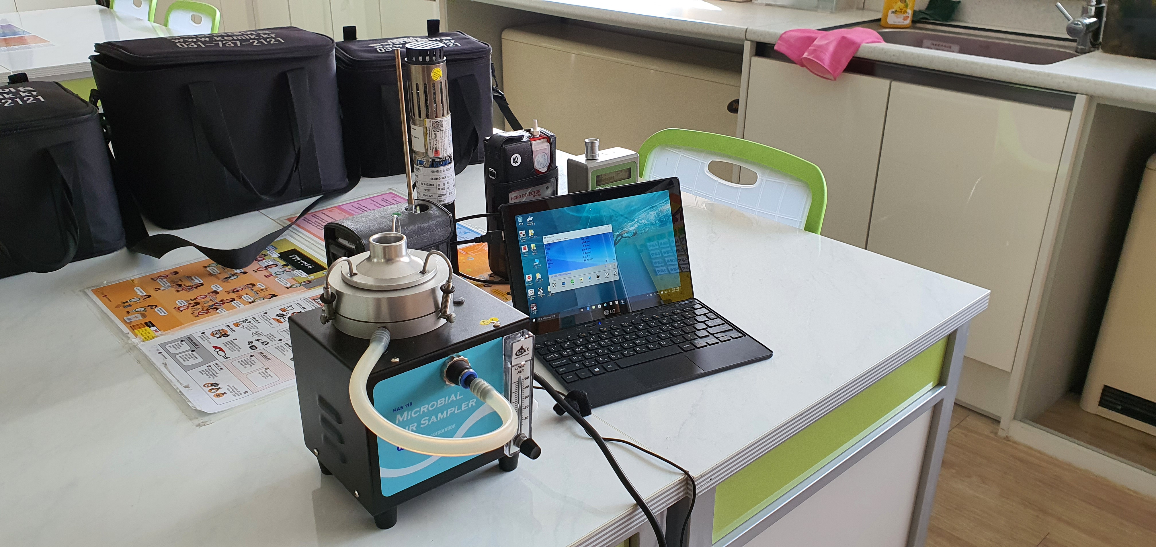 총부유세균은 부유세균측정기에 배지를 설치하여 공기를 충돌시켜 세균을 포집하는 충돌법으로 측정하며, 총 3회를 포집하여 세균을 배양시켜 결과값을 내게 됩니다. 낙하세균은 보건실과 식당만 측정하며, 측정기를 이용하는 것이 아닌 배지의 뚜껑만 약 5분간 열어놓고 닫아, 낙하세균의 양을 측정하게 됩니다.