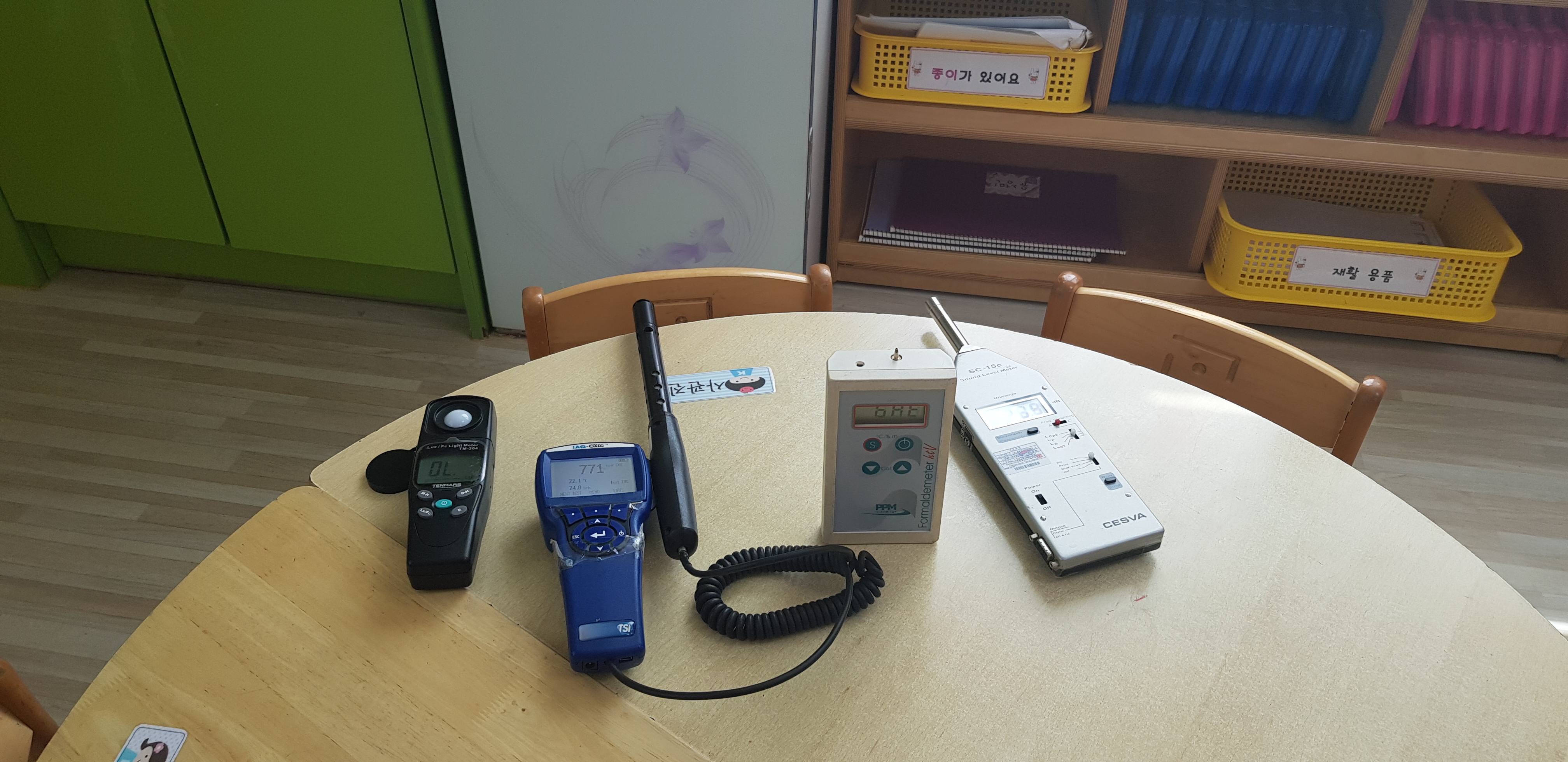 또 조도(인공조명) 측정은 칠판과 전체 책상을 기준으로 측정하며, 전체를 사각형으로 놓고 봤을때 각각 9곳 이상을 측정하여 평균을 내고, 최하 300룩스 이상 최대와 최소의 조도비가 3대 1을 넘지 않도록 해야 합니다.